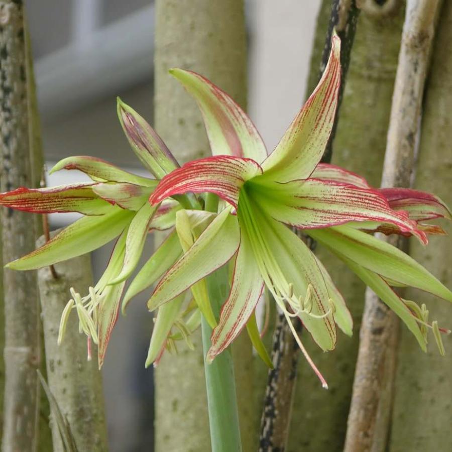 Цвет: кремово-зелёный. Цветы относительно миниатюрные, с волнистым краем лепестков, покрытых множеством красных точек и красивой красной каймой по краю. Цветок 10 см. 4-6 цветков на стрелке высотой 45-50 см. Долго цветущий. Годен для срезки.