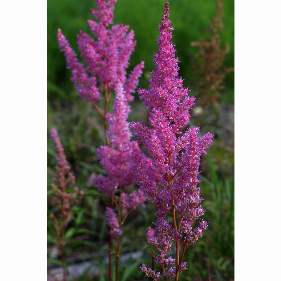 Астильба Арендса ‘Cattleya’ с ярко-розово-сиреневыми плотными, слегка поникающими соцветиями. Цветение в конце июля продолжительностью более месяца, а массового цветения 15 дней. Высота цветущей астильбы до 105 см. Хорошо растет в полутени и на нейтральной почве.