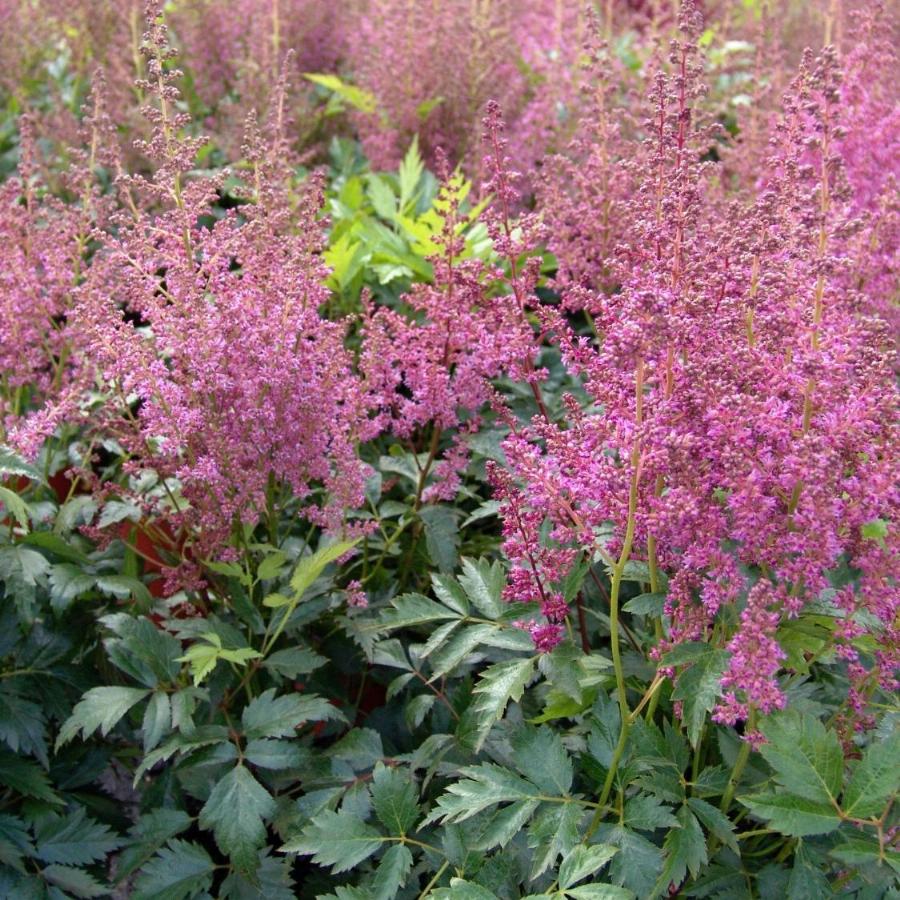 Японская астильба. Высота 60 см. Пурпурно-розовая, соцветие метельчатое, плотное, листья (h=30) зелёные, блестящие. Ранне-средняя.