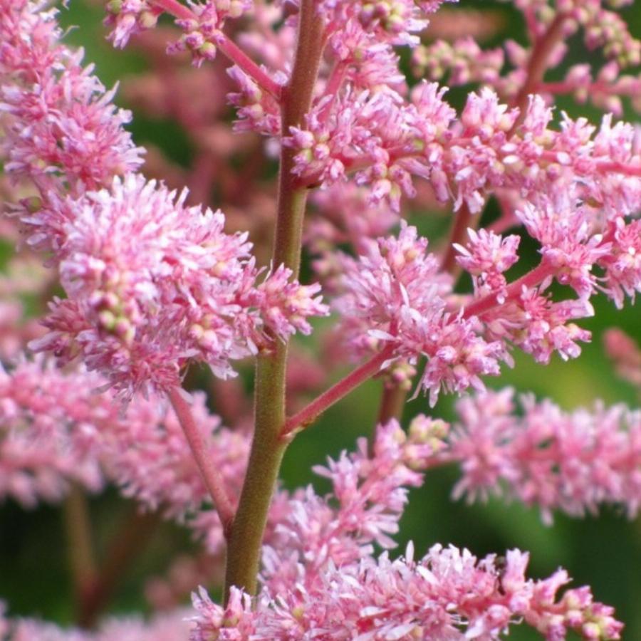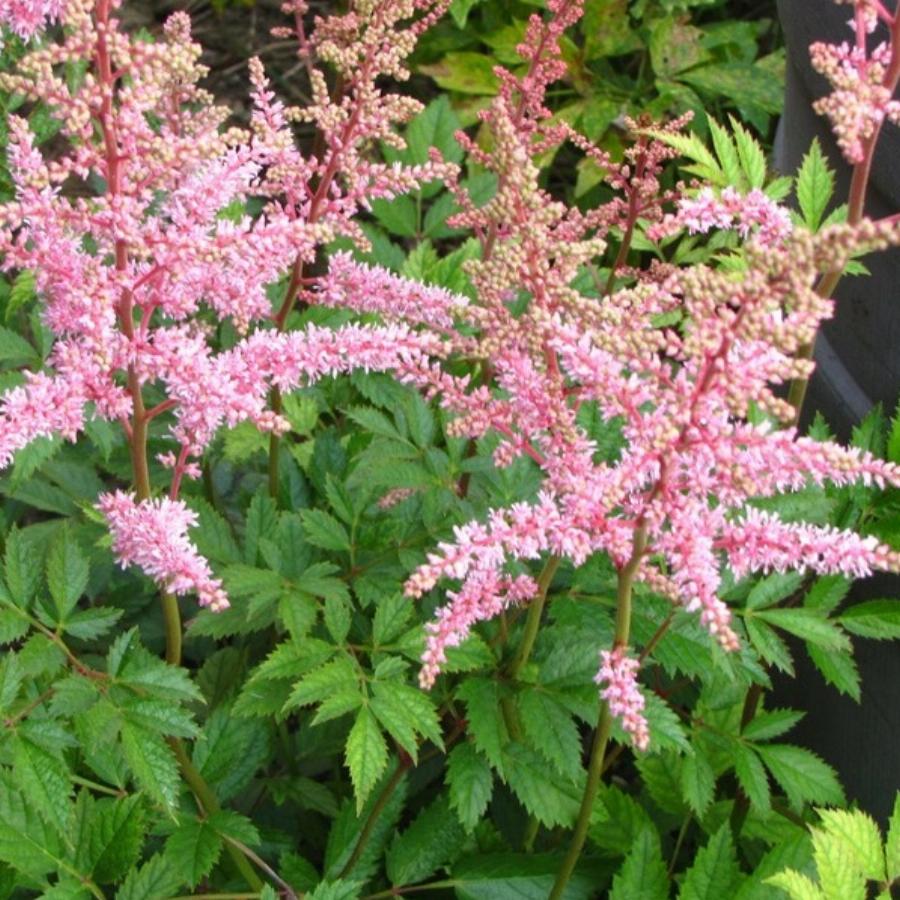 Японская астильба. Высота 60 см. Пурпурно-розовая, соцветие метельчатое, плотное, листья (h=30) зелёные, блестящие. Ранне-средняя.