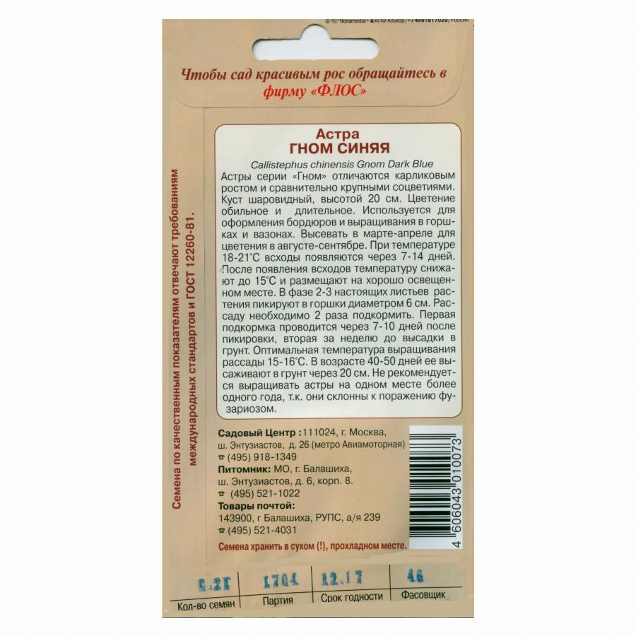 Астры серии «ГНОМ» отличаются карликовым ростом и сравнительно крупными соцветиями. уст шаровидный, высотой 20 см. Цветение обильное и длительное. Используется для оформления бордюров и выращивания в горшках и вазонах. Высевать в марте-апреле для цветения в августе- сентябре. При температуре 18-21 С всходы появляются через 7-14 дней. После появления всходов температуру снижают до 15 С размещают на хорошо освещенном месте. В фазе 2-3 настоящих листьев растения пикируют в горшки диаметром 6 см. Рассаду необходимо 2 раза подкормить. Первая подкормка проводится через 7-10 дней после пикировки, вторая за неделю до высадки в грунт. Оптимальная температура выращивания рассады 15-16 С. В возрасте 40-50 дней ее высаживают в грунт через 20 см. Не рекомендуется выращивать астры на одном месте более одного года, т.к. они склонны к поражению фузариоза