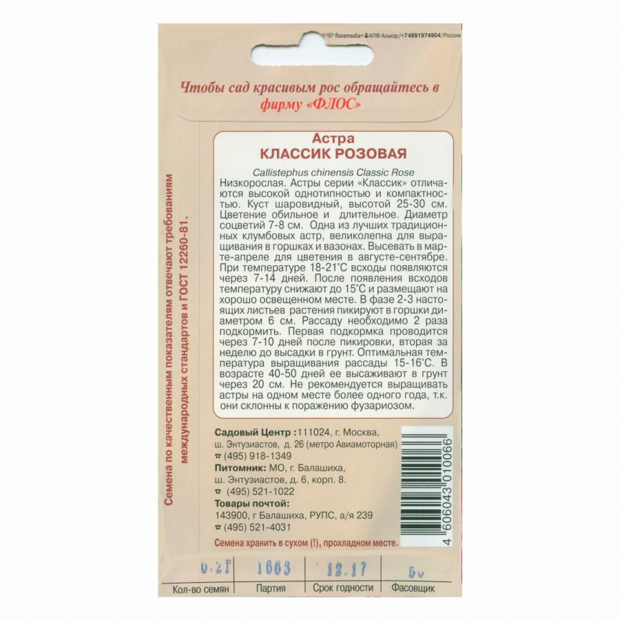 Низкорослая. Астры серии «Классик» отличаются высокой однотипностью и компактностью. Куст шаровидный, высотой 25-30 см. Цветение обильное и длительное. Диаметр соцветий 7-8 см. Одна из лучших традиционных клумбовых астр, великолепна для выращивания в горшках и вазонах. Высевать в марте- апреле для цветения в августе-сентябре. При температуре 18-21 С всходы появляются через 7-14 дней. После появления всходов температуру снижают до 15 С и размещают на хорошо освещенном месте. В фазе 2-3 настоящих листьев растения пикируют в горшки диаметром 6 см. Рассаду необходимо 2 раза подкормить. Первая подкормка проводится через 7-10 дней после пикировки, вторая за неделю до высадки в грунт. Оптимальная температура выращивания рассады 15-16 С. В возрасте 40-50 дней ее высаживают в грунт через 20 см. Не рекомендуется выращивать астры на одном месте более одного года, т.к. они склонны к поражению фузариозом.