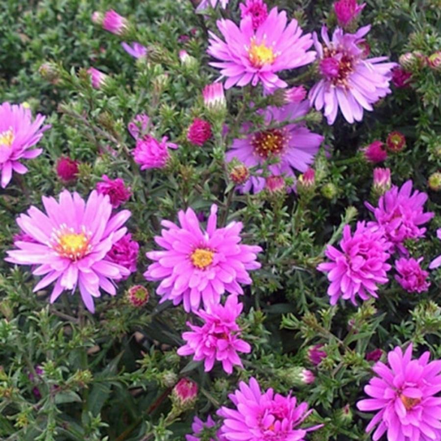 Астра кустарниковая: многолетнее травянистое растение с прямостоячими, сильно ветвистыми, опушенными стеблями до 50см высотой, образующими почти полушаровидные кустики. Листья сидячие, ланцетные, темно-зеленые, многочисленные. Цветет очень обильно в августе-сентябре 35-40 дней. Вид морозостоек. При хороших условиях выращивания могут покрывать большие площади. При сыром и холодном лете цветение сокращается. Размножают делением куста (чаще весной), подземными укоренившимися побегами, черенками. Пинк букет: цветы розовые с желтой серединкой.