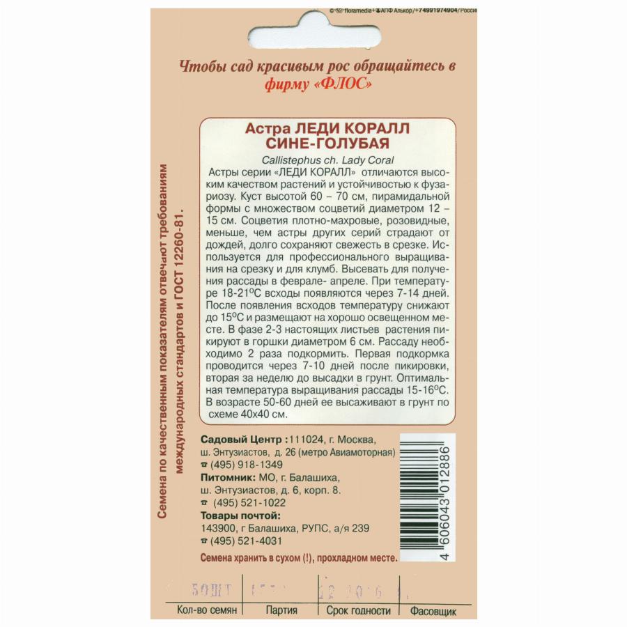 Астры серии «ЛЕДИ КОРАЛЛ» отличаются высоким качеством растений и устойчивостью к фузариозу. Куст высотой 60-70 см, пирамидальной формы с множеством соцветий диаметром 12-15 см. Соцветия плотно-махровые, розовидные, меньше, чем астры других серий страдают от дождей, долго сохраняют свежесть в срезке. Используется для профессионального выращивания на срезку и для клумб. Высевать для получения рассады в феврале-апреле. При температуре 18-21 С всходы появляются через 7-14 дней. После появления всходов температуру снижают до 15 С и размещают на хорошо освещенном месте. В фазе 2-3 настоящих листьев растения пикируют в горшки диаметром 6 см. Рассаду необходимо 2 раза подкормить. Первая подкормка проводится через 7-10 дней после пикировки, вторая за недклю до высадки в грунт. Оптимальная температура выращивания рассады 15-16 С. В возрасте 50-60 дней ее высаживают в грунт по схеме 40х40 см.