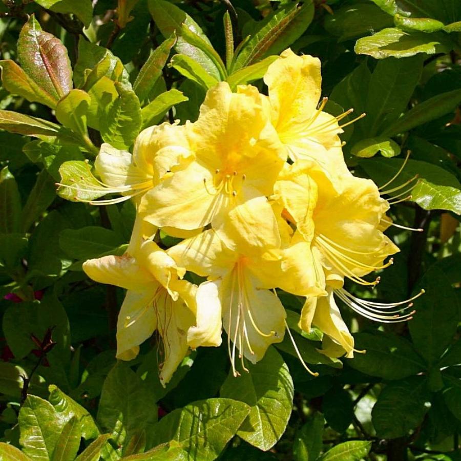Азалия листопадная mollis ‘Anneke’. Куст шаровидный, высотой 110-150 см. Крупноцветковая азалия с ароматными лимонно-жёлтыми цветками 8-10 см. в соцветиях по 9 шт. и ярко золотисто-жёлтой пятнистостью на лепестках у горловины. Морозостойкость без укрытия до -28 °C. Посадка в кислые почвы.
