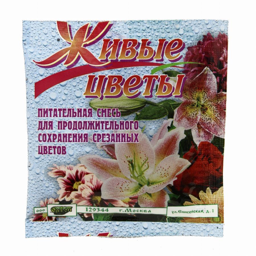 Питательная смесь для сохранения срезанных цветов. Продлевает срок сохранности букета до 2-3 недель. Рекомендуется использовать для лилий, пионов, циний и др. цветов. Питательная смесь «Живые цветы» обеспечивает цветы питательными веществами, улучшает водный баланс, способствует нормальному развитию цветов, предотвращает быстрое увядание и старение лепестков. Препарат продлевает срок сохранности букета до 2- 3 недель в зависимости от вида цветов и температуры окружающей среды. Применение: Обрезать стебли под водой острым ножом наискось. Удалить нижние листья, чтобы они не погружались в воду. Содержимое пакета растворить в 1 литре отстоянной воды комнатной температуры, налить раствор в вазу высотой 8-10 см. Раствор не менять, один раз в 1-3 дня по мере испарения доливать свежий раствор.