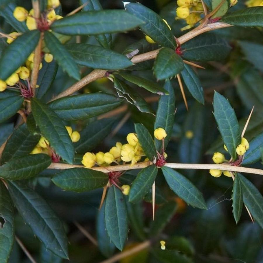 Вечнозеленый кустарник высотой до 1-1,5 м, с тонкими колючками. Листья до 2,5 см.Верхняя часть листа серовато-зелёная, нижняя — тёмно-зелёная, блестящая. Форма листа обратнояйцевидно-эллиптическая. Цветки золотисто-желтые.Цветёт в мае — июне. Плоды фиолетово-черные с сизым налетом. В суровые зимы может подмерзать (рекомендуется укрывать). Засухоустойчив.