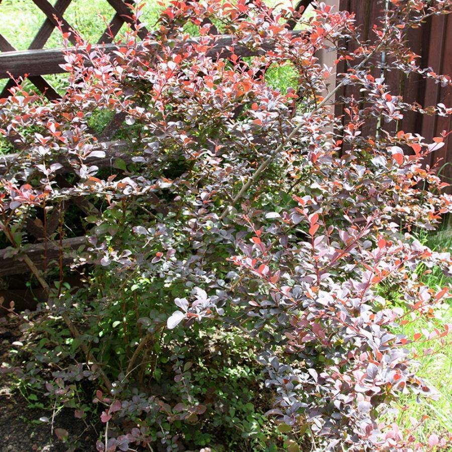 Высота 1 м, форма округлая, ниже вида, листья зеленые, постепенно окрашиваются в темно-красный.