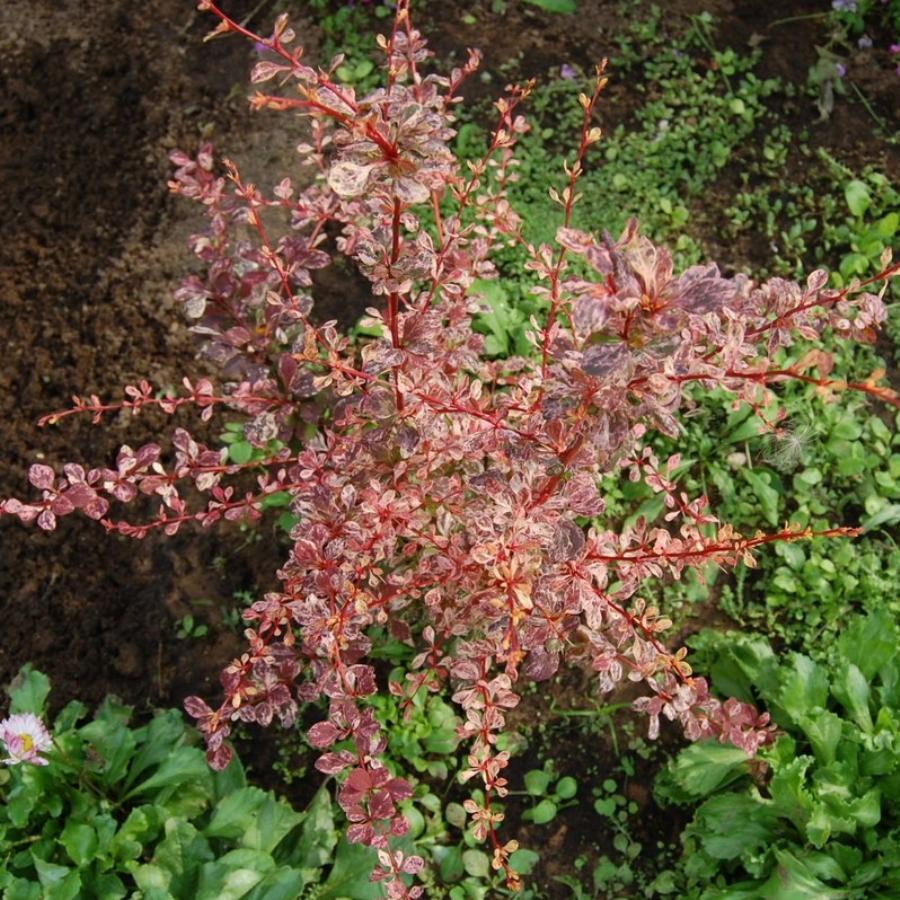 Колючий кустарник с оригинальными пятнистыми листьями, достигает высоты 200-300 см. Красные листья покрыты белыми, розовыми, серыми пятнышками. Цветки желтые, распускаются в мае. Зимостоек, засухоустойчив. Подходит для составления цветных композиций.