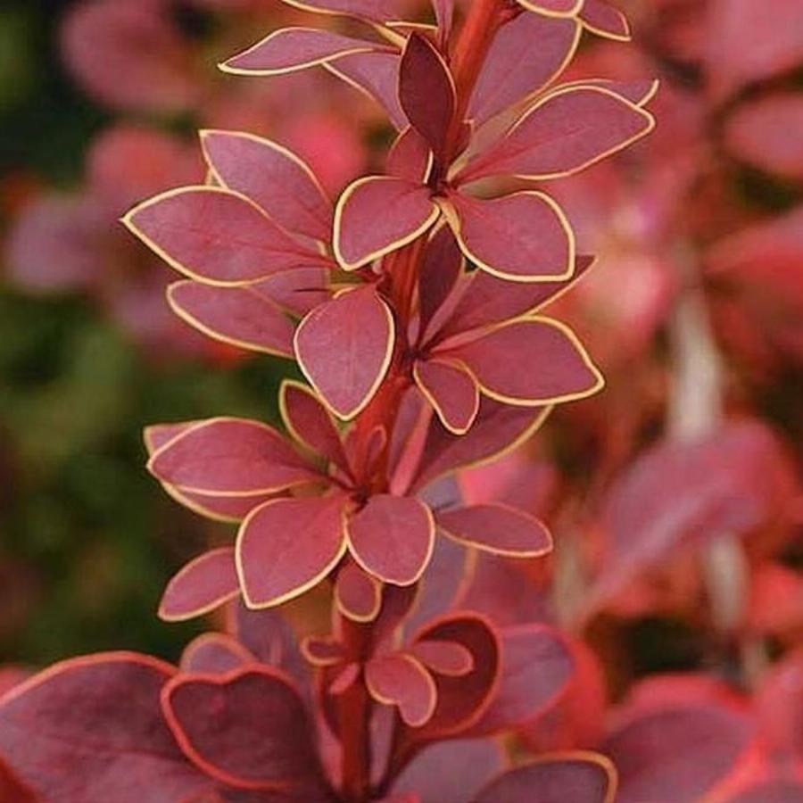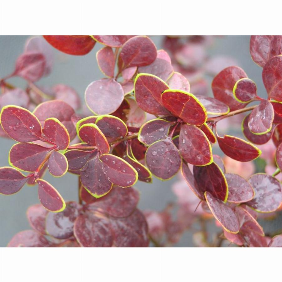 Н=2-3 м, D=2 м. Крупный раскидистый кустарник. Листья пурпурно- красные с узким жёлтым краем. Цветки жёлтые, плоды коралловые, долго остаются на кусте. К почве нетребователен. Хорошо реагирует на стрижку. Цветение в мае, цветки D=1 см, внутри желтые, снаружи красные.