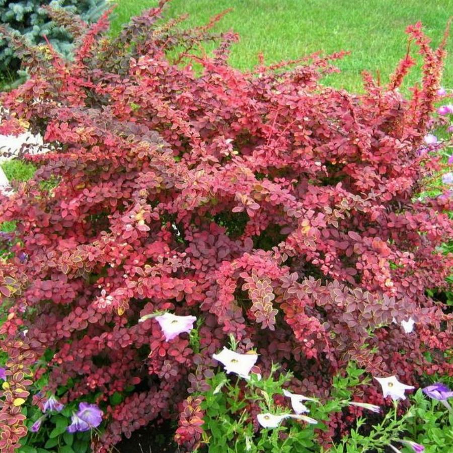 Н=2-3 м, D=2 м. Крупный раскидистый кустарник. Листья пурпурно-красные с узким жёлтым краем. Цветки жёлтые, плоды коралловые, долго остаются на кусте. К почве нетребователен. Хорошо реагирует на стрижку. Цветение в мае, цветки D=1 см, внутри желтые, снаружи красные.