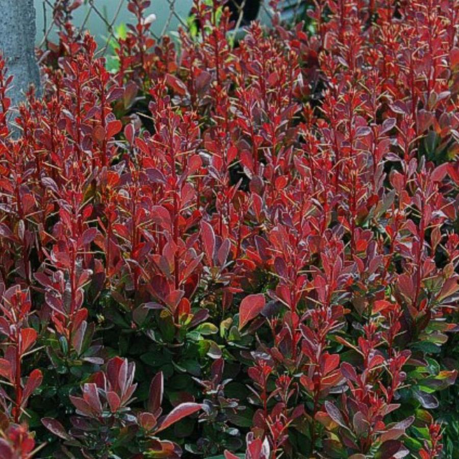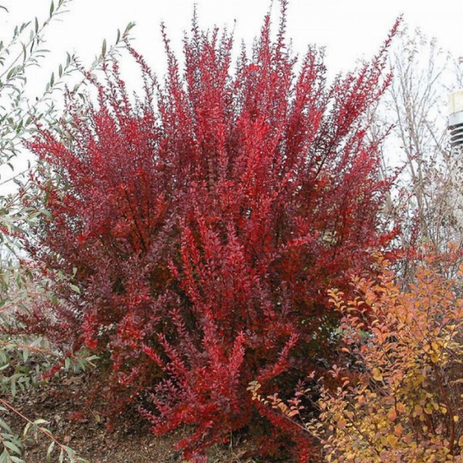 Барбарис thunbergii ‘Red Rocket’, высотой до 2 м., диаметр кроны до 1м. Крона колонновидная. Растет быстро. Период цветения май. Цветки ярко-желтые, собраны в кисти. Плоды оранжевые. Листья крупные, красные, округлые, осенью оранжевые. Место предпочитает солнечное, почву умеренно влажную, супеси и суглинки.