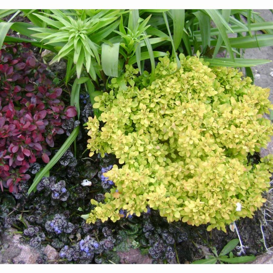 Карликовый шаровидный кустарник высотой до 0,3 м и диаметром до 0,5 м. Отличается мелкими листьями яркого лимонно-желтого цвета, не выгорают на солнце, которые в осенний период становятся оранжево-красными. Растет медленно. Плоды — продолговатые, оранжево-красные ягоды — созревают в сентябре.