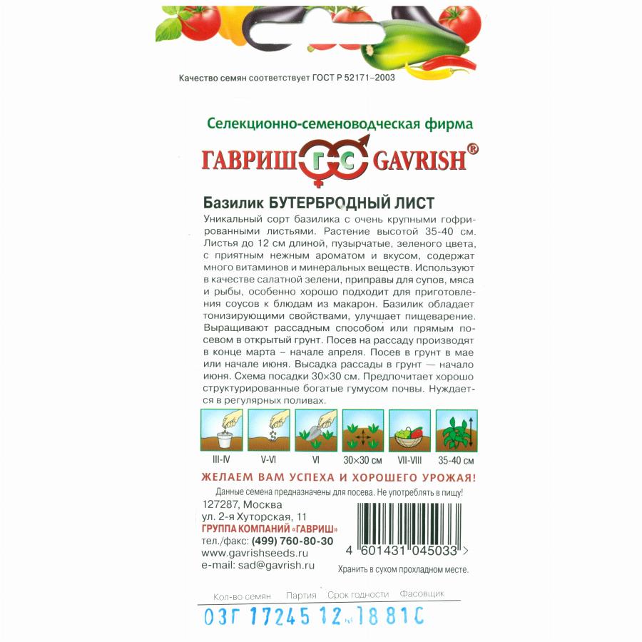 Уникальный сорт базилика с очень крупными гофрированными листьями. Растение высотой 35-40 см. Листья до 12 см длиной, пузырчатые, зеленого цвета, с приятным нежным ароматом и вкусом, содержат много витаминов и минерльных веществ. Используют в качестве салатной зелени, приправы для супов, мяса и рыбы, особенно хорошо подходит для приготовления соусов к блюдам из макарон. Базилик обладает тонизирующими свойствами, улучшает пищеварение. Выращивают рассадным способом или прямым посевом в открытый грунт. Посев на рассаду производят в конце марта – начале апреля. Посев в грунт в мае или начале июня. Высадка рассады в грунт – начало июня. Схема посадки 30×30 см. Предпочитает хорошо структурированные, богатые гумусом почвы. Нуждается в регулярных поливах.