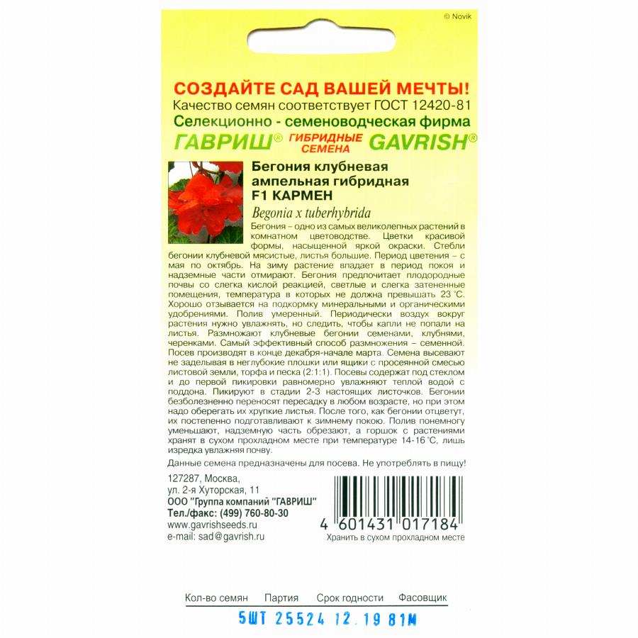 БЕГОНИЯ АМПЕЛЬНАЯ КАРМЕН F1 4 ШТ гавриш