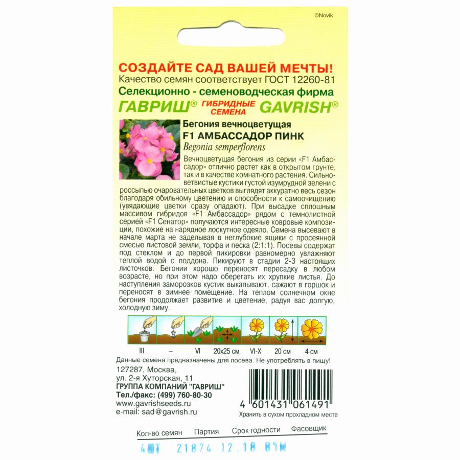Вечноцветущая бегония из серии «F1 Амбассадор» отлично растет как в открытом грунте, так и в качестве комнатного растения. Сильноветвистые кустики густой изумрудной зелени с россыпью очаровательных цветков выглядят аккуратно весь сезон благодаря обильному цветению и способности к самоочищению (увядающие цветки сразу опадают). При высадке сплошным массивом губридов «F1 Амбассадор» рядом с темнолистной серией «F1 Сенатор» получаются интересные ковровые композиции, похожие на нарядное лоскутное одеяло. Семена высевают в начале марта не заделывая в неглубокие ящики с просеянной смесью листовой земли, торфа и песка (2:1:1). Посевы содержат под стеклом и до первой пикировки равномерно увлажняют теплой водой с поддона. Пикируют в стадии 2-3 настоящих листочков. Бегонии хорошо переносят пересадку в любом возрасте, но при этом надо оберегать их хрупкие листья. До наступления заморозков кустик выкапывают, сажают в горшок и переносят в зимнее помещение. На теплом солнечном окне бегония продолжает развитие и цветение, радуя вас долгую, холодную зиму.