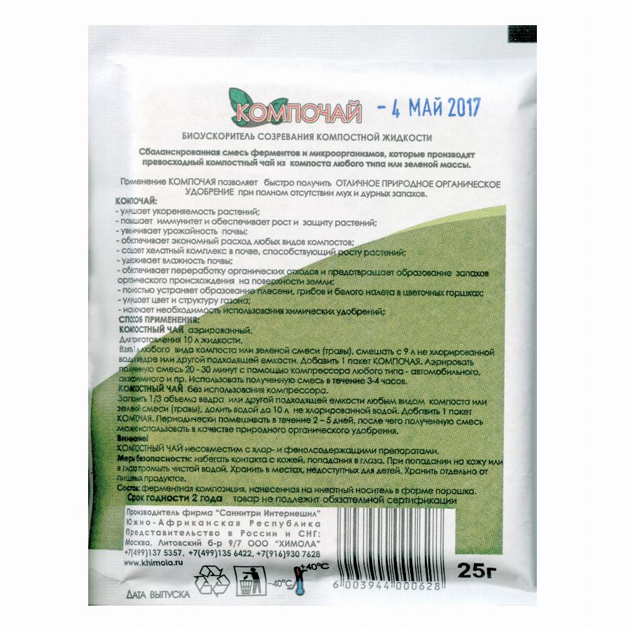 Биоускоритель созревания компостной жидкости. Сбалансированная смесь ферментов и микроорганизмов, которые производят привосходный компостный чай из компоста любого типа или зеленой массы. Применение КОМПОЧАЯ позволяет быстро получить отличное природное органическое удобрение при полном отсутствии мух и дурных запахов.