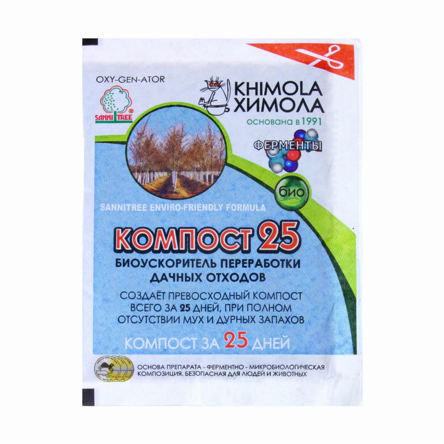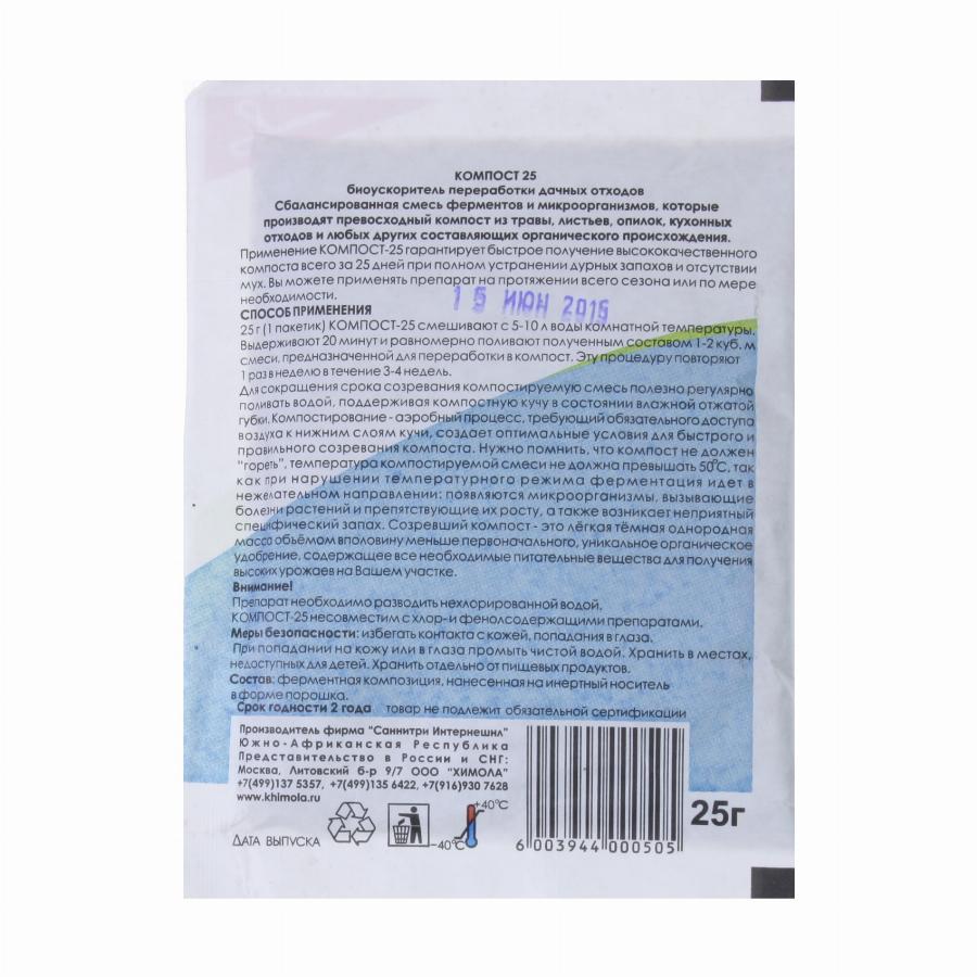 Представляет собой сбалансированную смесь из микроорганизмов и ферментов, которые создают отличный компост из травы, опилок, листьев, кухонных отходов, а также любой другой органики. Применяя Компост-25, вы гарантировано быстро получите высококачественный компост всего за 25 дней, при этом не будет никаких дурных запахов и мух. Биоактиватор компостирования Компост-25 можно применять в течение всего сезона.