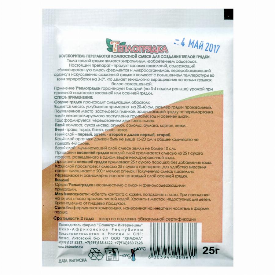 Биоускоритель переработки компостной смеси для создания теплой грядки. Содержит сбалансированную смесь ферментов и микроорганизмов, перерабатывающий органику в искуственно созданной грядке в компост с повышением температуры во время переработки на 3-5 градусов, что делает технологию выращивания на теплых грядках более совершенной.