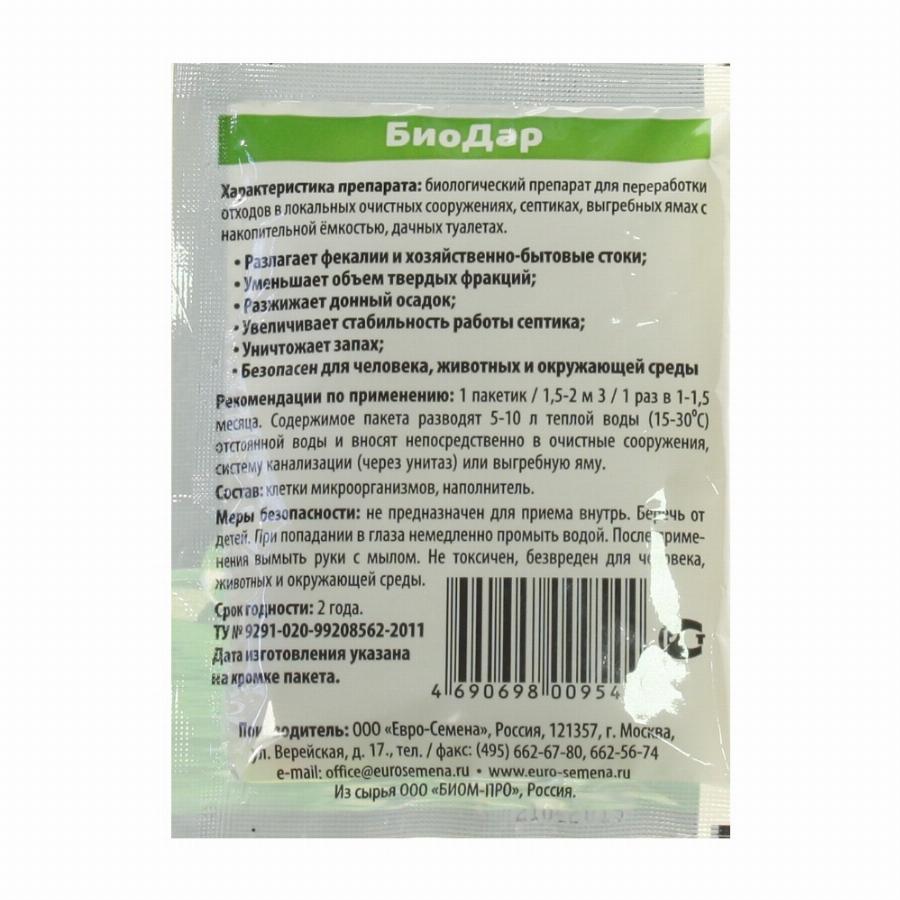 Биологический препарат для переработки отходов в локальных очистных сооружениях,септиках,выгребных ямах с накопительной ёмкостью,дачных туалетов.Разлагает фикалии и хозяйственно-бытовые стоки.Уменьшает объем твердых фракций.Расжижает донный осадок.Увеличивает стабильность работы септика.Уничтожает запах.Безопасен для человека,животных и окружающей среды.