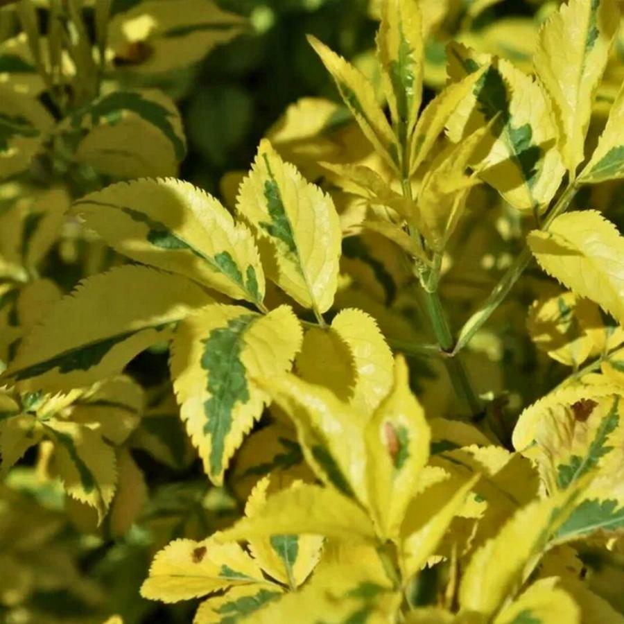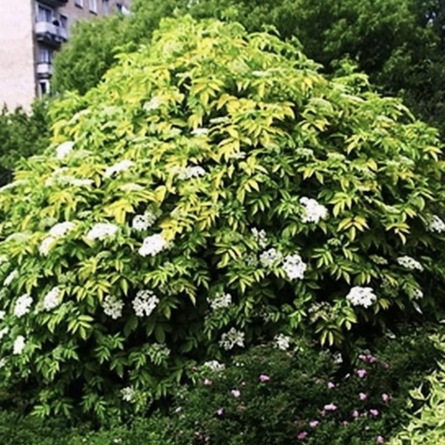 Кустарник. Высота 3-5м, диаметр 3-4м. Крона широкоокруглая, раскидистая. Растет быстро. Период: июнь-июль. ение: Цветки желтовато-белые, собраны в зонтиковидные соцветия. Плоды чёрные, блестящие. Место: Солнце-полутень. Почва: Богатая азотом, плодородная, умеренно влажная. Листва: Крупные,сложные,из 5-7 ланцетных листочков, светло-зелёные с кремовыми пятнами.