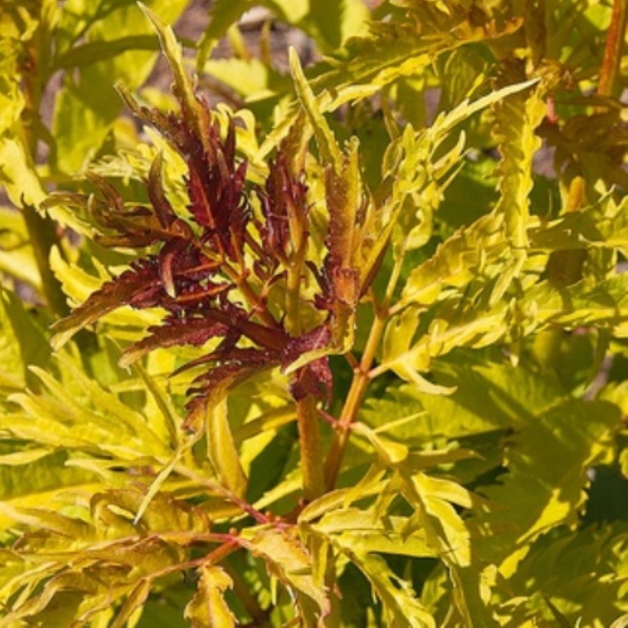 Кустарник родом из Европы. Высота и диаметр кроны 2-4 м. Ежегодный прирост в высоту и ширину 60-80 см. Долговечность 30 лет. Крона густая. Листья убчатые, рассеченные почти до середины, золотисто-желтого-цвета. Цветение в мае, цветки желто-зеленые мелкие собраны в метельчатые соцветия длиной до 7 см. Плоды красные шаровидные созревают в июле. К почвам нетребовательна, засухоустойчива. Используется как ординар, в группах, живых изгородях.