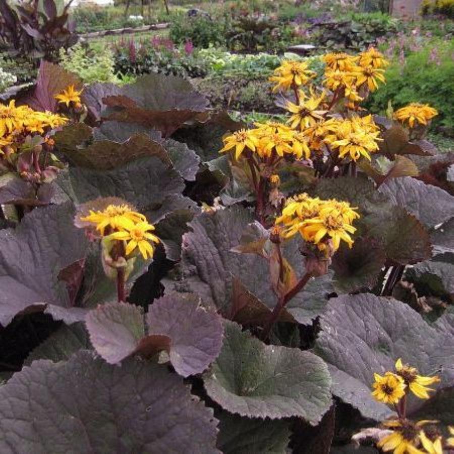 Бузульник зубчатый ‘Dark Beauty’ — эффектное растение до 100см высотой. Листья крупные, почковидные, собраны в прикорневую розетку. Соцветия — корзинки 7 — 8 см в диаметре, собраны в метельчатое соцветие. Язычковые цветки светло-желтые, трубчатые — светло-коричневые. Цветет в августе — сентябре 30 дней. Зимостоек, но в суровые зимы может слегка подмерзать. Высота 80 – 100 см