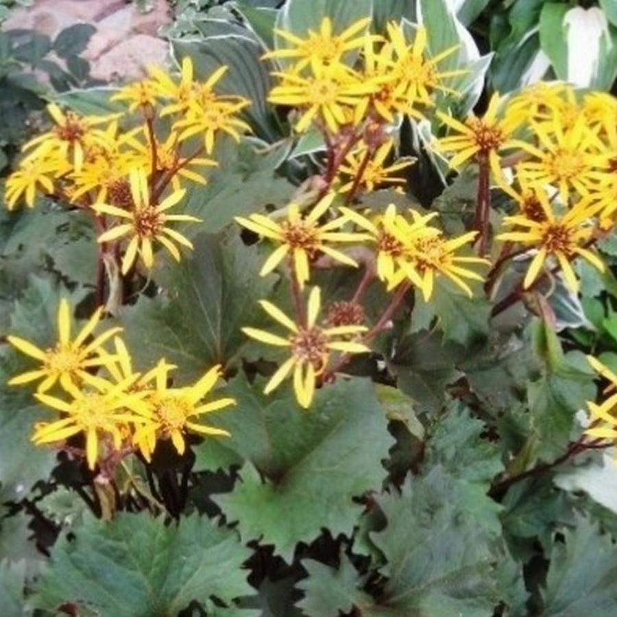 Высота 50 см, диаметр 45 см. Лист треугольный, рвано-резной. Листва появляется темная, затем светлеет, но остается с красными прожилками, а затем становится более темной бронзово-зеленой. Тень-полутень, влага.