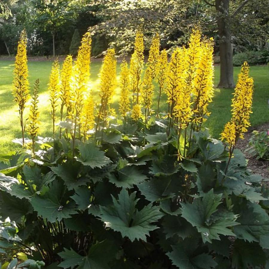 Эффектное растение 90-100 см высотой. Листья зеленые, крупные, сердцевидные с грубо зазубренными краями, осенью пурпурно-малиновые. Многочисленные желтые цветочные корзинки собраны в колосовидное соцветие. Цветение в июле-августе. Хорошо развивается в полутени. Зимостоек без укрытия.