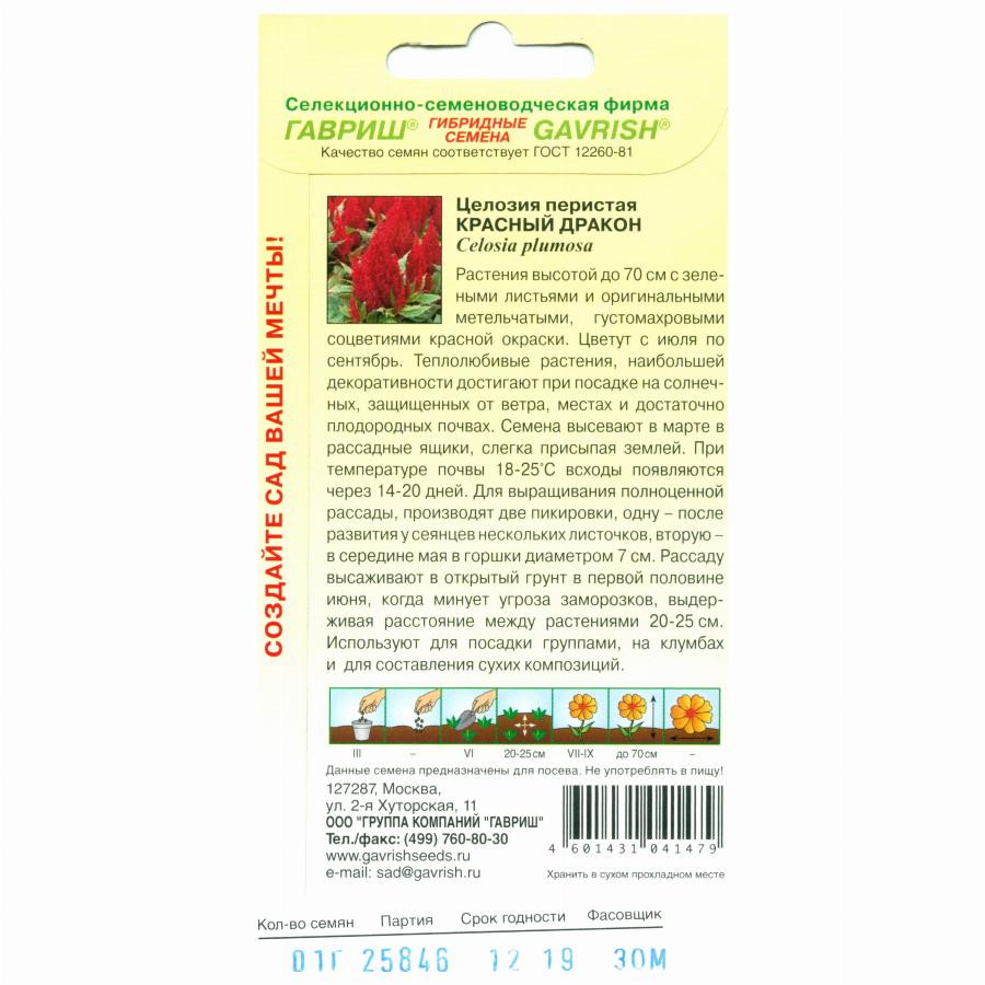 Растения высотой до 70 см с зелеными листьями и оригинальными метельчатыми, густомахровыми соцветиями красной окраски. Цветут с июля по сентябрь. Теплолюбивые растения, наибольшей декоративности достигают при посадке на солнечных, защищенных от ветра, местах и достаточно плодородных почвах. Семена высевают в марте в рассадные ящики, слегка присыпая землей. При температуре почвы 18-25° С всходы появляются через 14-20 дней. Для выращивания полноценной рассады, производят две пикировки, одну — после развития у сеянцев нескольких листочков, вторую – в середине мая в горшки диаметром 7 см. Рассаду высаживают в открытый грунт в первой половине июня, когда минует угроза заморозков, выдерживая расстояние между растениями 20-25 см. Используют для посадки группами, на клумбах и для составления сухих композиций.
