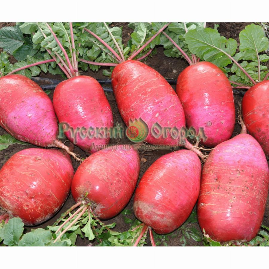 Новый раннеспелый гибрид, созревающий через 35-40 дней от посева. Огромные, розово-красные корнеплоды на 1/2 выступают над землей. Созревая, достигают размера 16х12 см, и массы 2 кг. Мякоть белая, отличных вкусовых качеств, содержание сахара выше среднего. До 2-х кг редиса из одного семечка.