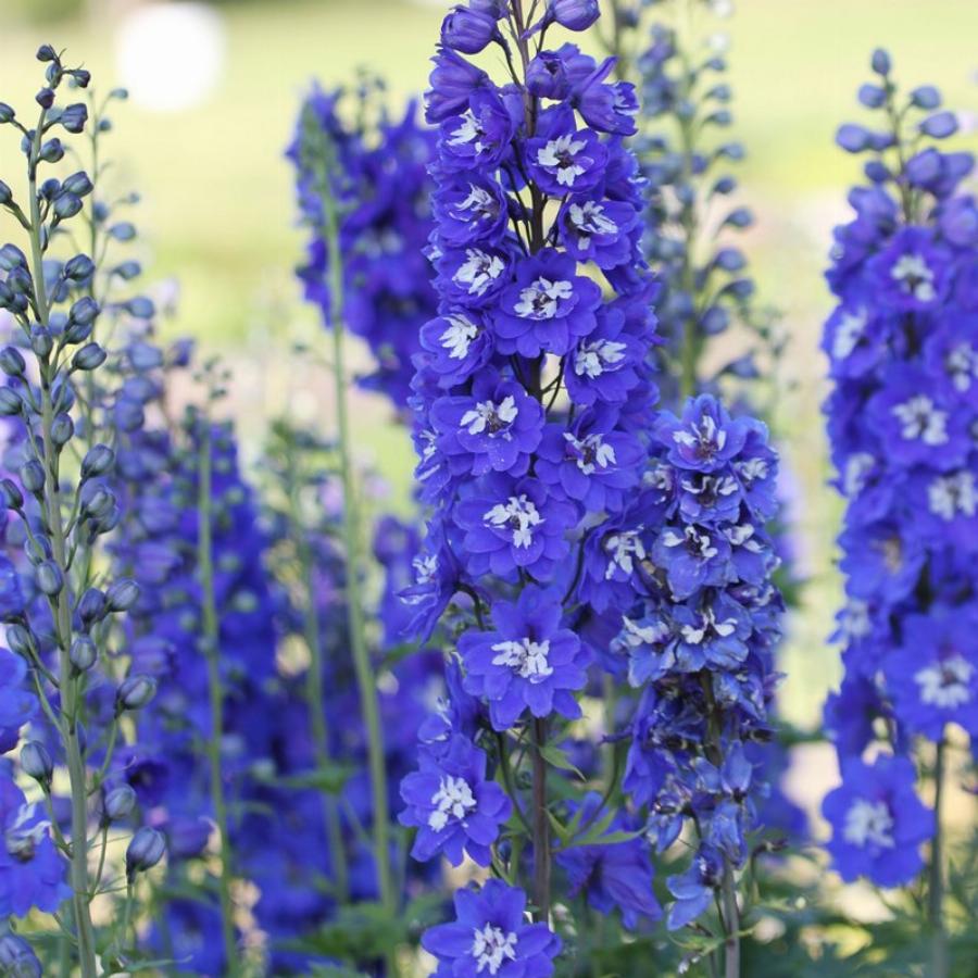Растение 150-170 см высотой. Цветки полумахровые до 5,5 см в диаметре, светло-синие с белым глазком. Соцветие конусовидное, 40-50 см длиной. Цветет с июля 14-18 дней.