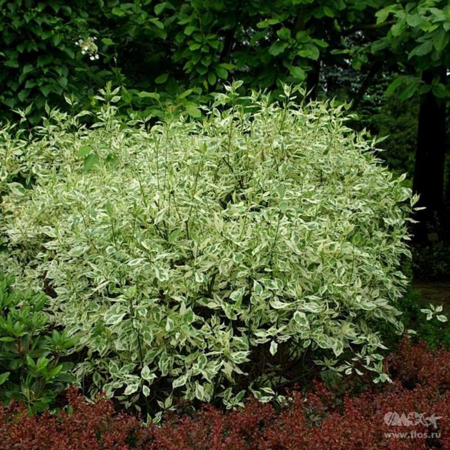 Листопадный, стройный кустарник до 3 м высотой, с прямыми, красными побегами. Листья заостренные, зеленые с сероватым оттенком, с белым окаймлением. Цветет в начале лета розоватыми цветками; плоды – несъедобные шаровидные костянки синевато-белой окраски. Теневынослив, засухоустойчив, к почвам нетребователен. Морозостоек.