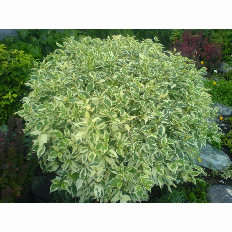 Листопадный, стройный кустарник до 3 м высотой, с прямыми, красными побегами. Листья заостренные, зеленые с сероватым оттенком, с белым окаймлением. Цветет в начале лета розоватыми цветками; плоды – несъедобные шаровидные костянки синевато-белой окраски. Теневынослив, засухоустойчив, к почвам нетребователен. Морозостоек.