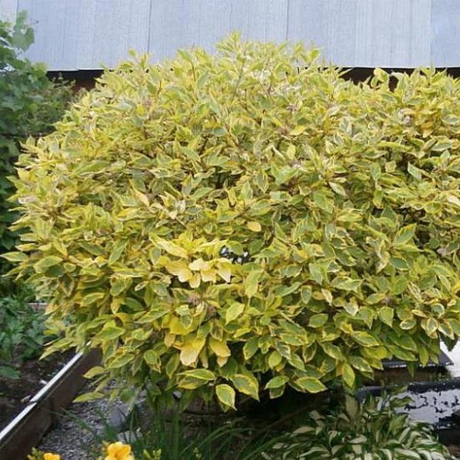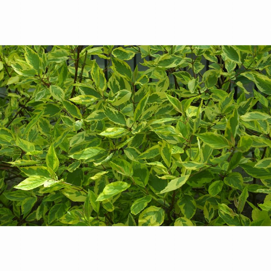 Раскидистый кустарник до 3 м высотой. Годовой прирост ок. 20 см. Побеги темно красные. Цветки белые, появляются в июне. Плоды шаровидные, белые до голубоватых. Декоративные зелёные листья с широким жёлтым слегка розоватым окаймлением. Хорошо растёт на любой почве, если она достаточно влажна. Рекомендуется на солнечные до полутенистых места, для каждой зелени.