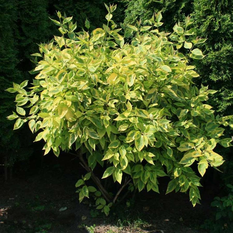 Кустарник с тёмно-красными побегами. Листья с широким жёлтым краем и жёлто-зелёными пятнами. Предпочитает солнечные места. Время цветения/срок созревания: май-июнь Высота: до 2,5м.