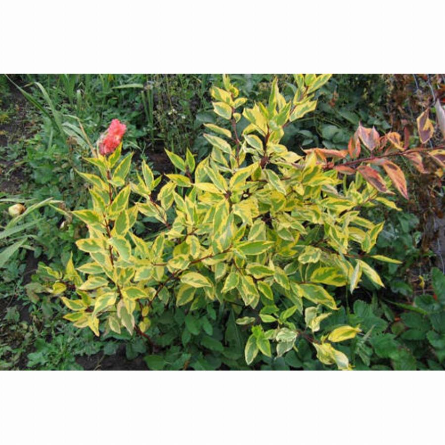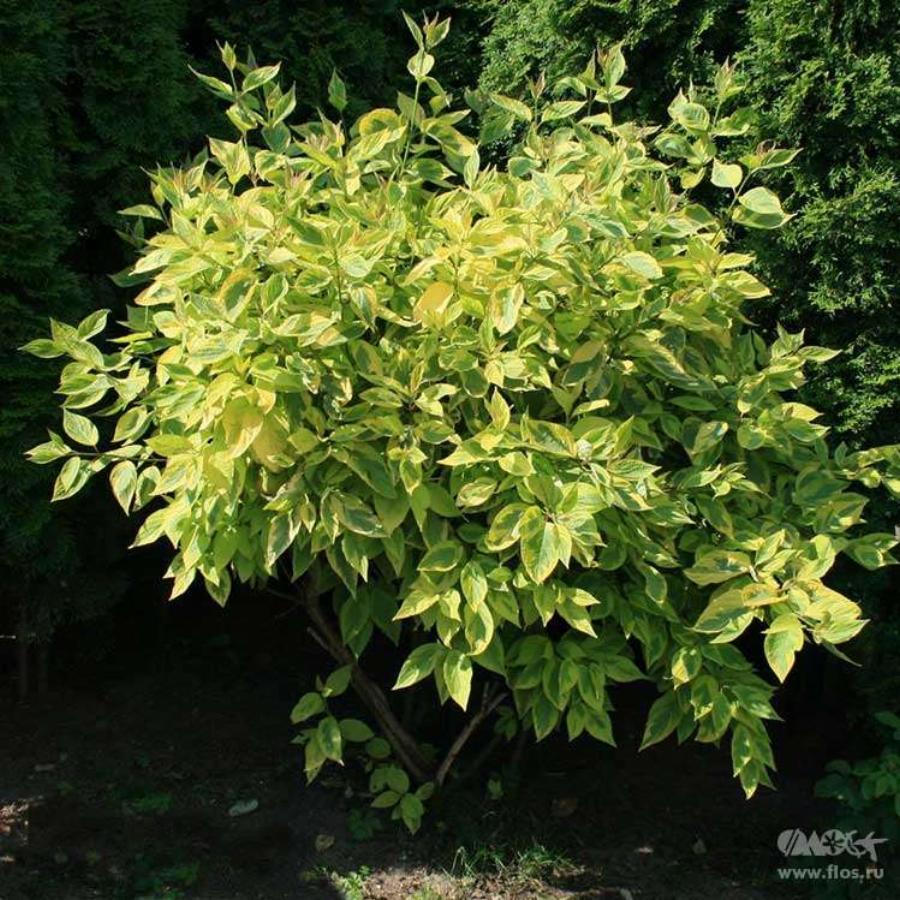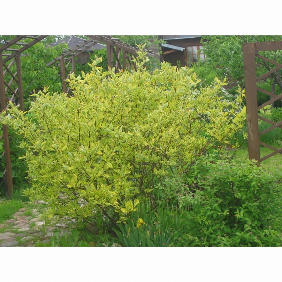 Кустарник с тёмно-красными побегами. Листья с широким жёлтым краем и жёлто-зелёными пятнами. Предпочитает солнечные места. Время цветения/срок созревания: май-июнь Высота: до 2,5м.
