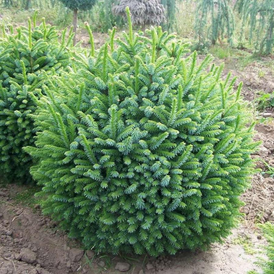 небольшой карликовый хвойный кустарник до 80см высотой и 120см шириной, с шаровидной или подушковидной формой кроны. Растет очень медленно. Годовой прирост в высоту составляет 3-5см, а в ширину 5-7см. Хвоя плоская, блестящая, густая, сверху окрашена в темно-зеленый цвет с легким с сизоватым отливом, нижняя сторона пепельно-зеленая.