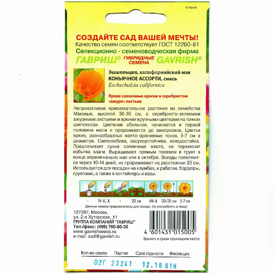 Все товары ► Почвогрунты ► Грунты ЭШШОЛЬЦИЯ КОНЬЯЧНОЕ АССОРТИ 0,2 Г гавриш Цена: 26.40 р. Производитель: ГАВРИШ Страна производства: Россия