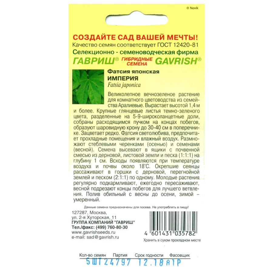 Великолепное вечнозеленое растение для комнатного цветоводства из семейства Аралиевые. Вырастиет до высоты 1,4 м и более. Крупные глянцевые листья темно-зеленого цвета, разделенные на 5-9-широко-ланцетные доли, собраны расходящимся пучком на концах побегов, образуя шаровидную крону до 30-40 см в поперечнике. Зацветает редко. Фатсия светолюбива, предпочитает прохладные помещения и влажный воздух. Размножают стеблевыми черенками (осенью) и семенами (весной). Семена высевают в ящики с почвенной смесью из дерновой, листовой земли и песка (1:1:1) на глубину 1 см. Всходы появляются при температуре воздуха и почвы около 18°C. Окрепшие сеянцы рассаживают в горшки с дерновой, перегнойной землей и песком (2:1:1) по одному. Молодые растения регулярно подкармливают, ежегодно пересаживают, весной подрезают концы побегов для лучшего ветвления. Полив обильный с весны до осени, зимой — умеренный.