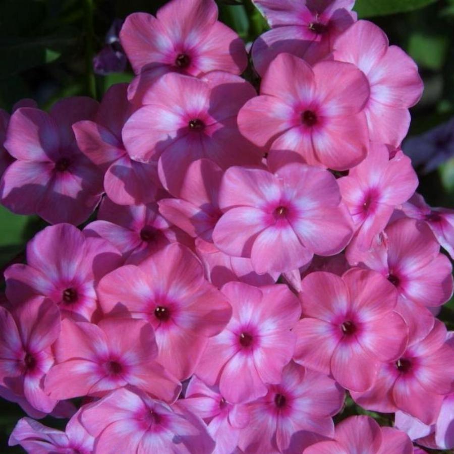 Светло-розовый с белой звездой и ярким малиновым колечком, не выгорает. Соцветие округло-коническое, плотное.