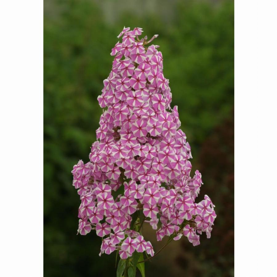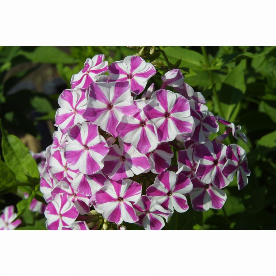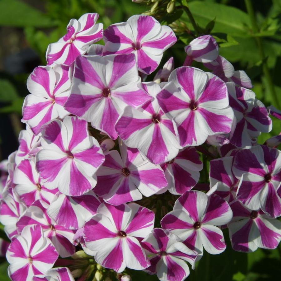 Высота куста 70 см. Диаметр цветка 1,5 см. Белый с яркой сиренево-малиновой полосой по центру лепестков. Эффектная двухцветная окраска
