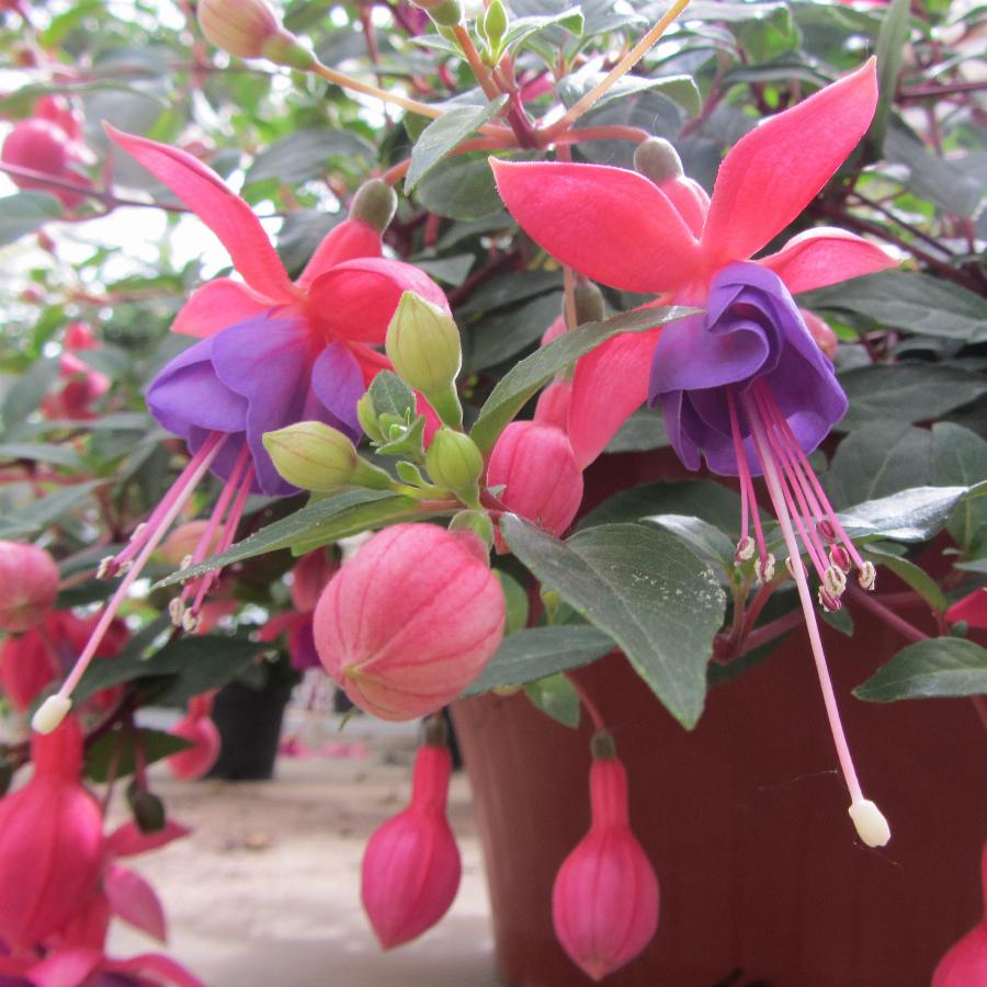 Цветы яркие, обильные, махровые. Чашелистики ярко-розовые, Юбочка светло-синяя с розовыми мазками.Уход: регулярные поливы, но без избытка воды, подкормки комплексным удобрением через каждые 10-14 дней обеспечат обильное и непрерывное цветение.Зимой фуксии необходимо обеспечить период покоя.