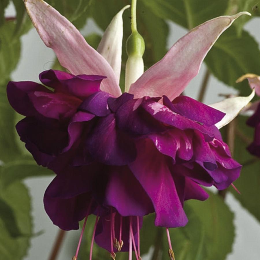 Ампельная форма. Бутоны округлые крупные. Чашелистики светло-розовые. Юбочка фиолетовая с розовыми бликами. Цветы крупные густомахровые.