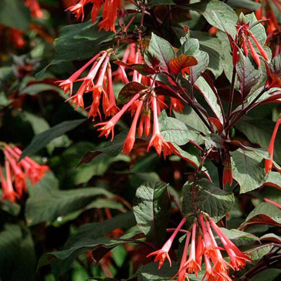 Кустовая форма. Бутоны продолговатые. Чашелистики темно-розовые. Юбочка оранжево-красная. Цветы простые, собранные в кисти. Листья темно-зелено-бордовые, крупные, бархатистые.