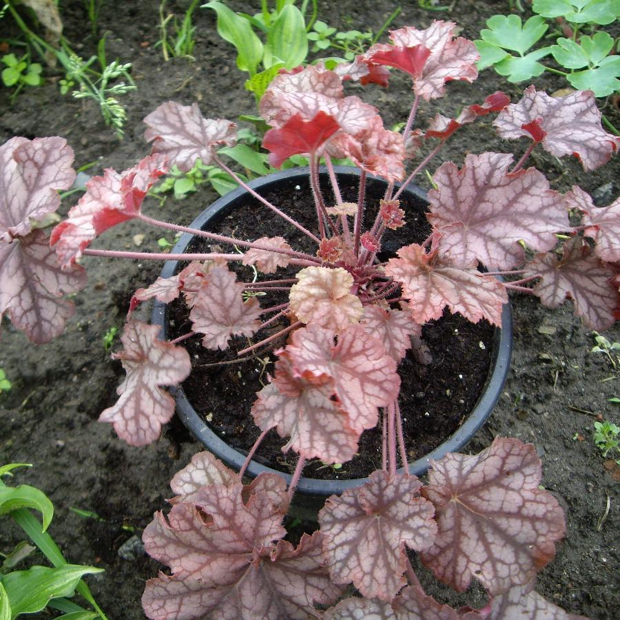 Размер 45 x 45 см — знаменитый сорт, завоевавший множество медашей в Америке и Европе, легко узнаваемый по сильно гофрированным листьям с очень приятной красно-коричневатой окраской и светлым серебристым пятнам; одна из самых любимых нами гейхер!