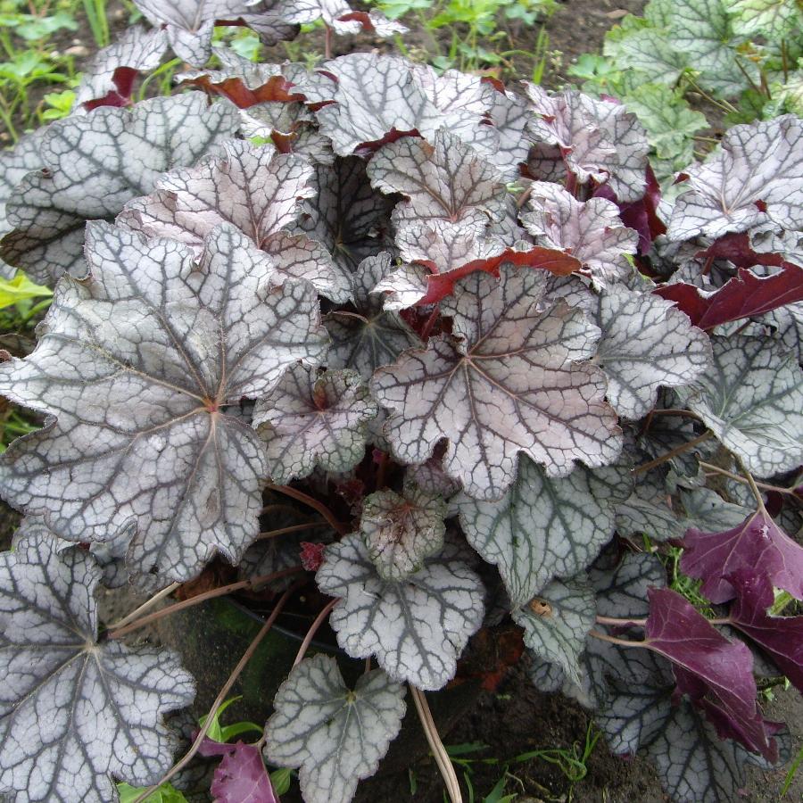 Еще одна изумительная гейхера, которая сильно меняет окраску листвы. Молодой лист имеет малиново-пурпурные оттенки на слегка проступающем зеленоватом фоне и темно коричневые (зеленовато-коричневые) прожилки; со временем малиново-пурпурные тона уходят и вместо них появляются контрастные светло серебристые пятна на холодном темно зеленом с пурпурными оттенками фоне; листва очень красиво смотрится весь сезон; ее окраска и тона сбалансированы как будто цвета подбирал художник — по нашему мнению это лучшая гейхера в своем классе окраски! не удивительно, что сорт завоевал серебряную медаль в Бельгии! по размерам куст ближе к крупным но сорт не отличается быстрым ростом.