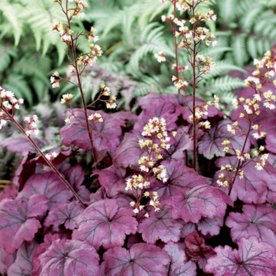 Высотой 30-40 см и около 35 см в диаметре. Пурпурные листья с темными жилками и ярким серебряным блеском придают растению особую эффектность. Старые листья серебристые с пурпурными жилками. Бело-розовые цветы на невысоких темных цветоносах прекрасно дополняют облик этой компактной гейхеры. Растение предпочитает полутень, но в северных регионах возможна посадка на открытом солнце.