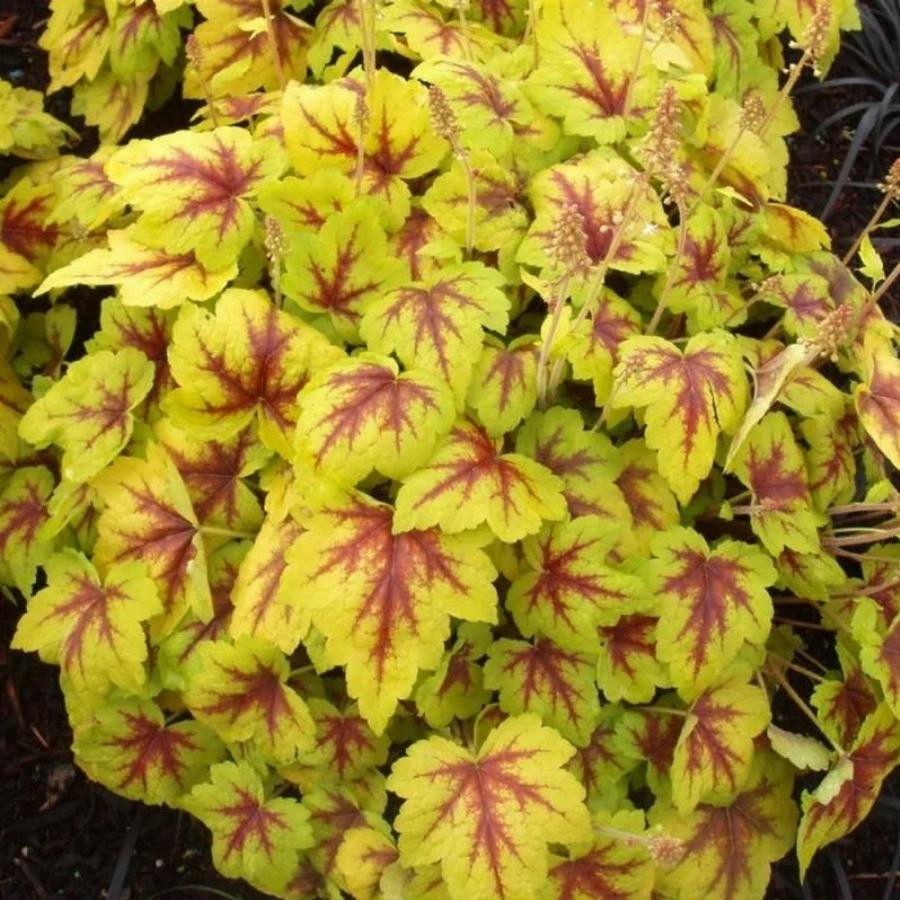 Высота растения 15см. Диаметр: 30см. Цветонос: 20-25 см. Ярко-желтая листва с бордово-красным центром и прожилками. По мере роста и зрелости листа площадь красного центра увеличивается, его расцветка становится интенсивнее. Цветок: белый. Цветет июнь-август. Морозостойкость до (-35°С).