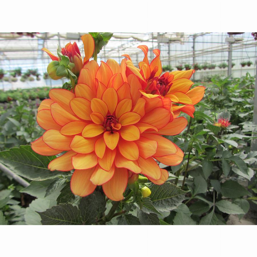 Куст низкорослый, компактный, пышный, стебли высотой 0,45 м. Листья тёмно-зеленые, многочисленные. Соцветие махровое, нижняя сторона лепестка красная, верхняя сторона желтая, диаметром до 13 см. Цветет с конца июня по ноябрь.